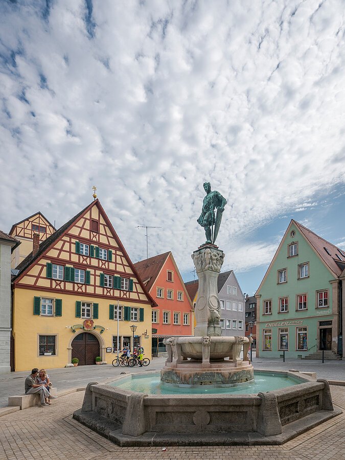 • Brunnen mit Statue auf einem Platz, umgeben von Fachwerkhäusern und Menschen, unter bewölktem Himmel.