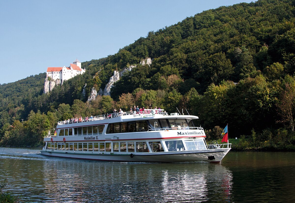 • Ausflugsschiff Maximilian II auf Fluss vor bewaldetem Hügel mit Schloss auf Felsen im Hintergrund bei klarem Himmel